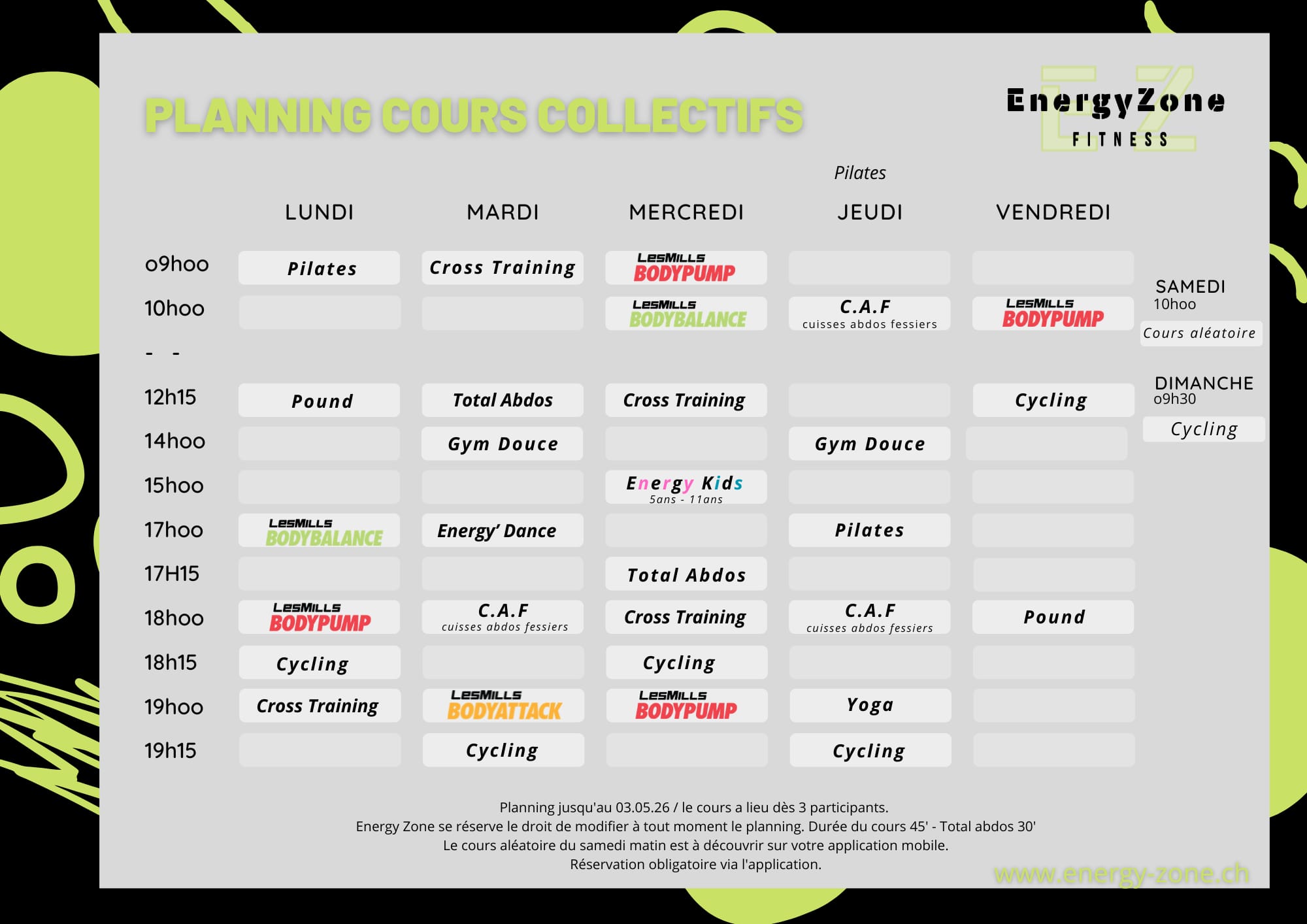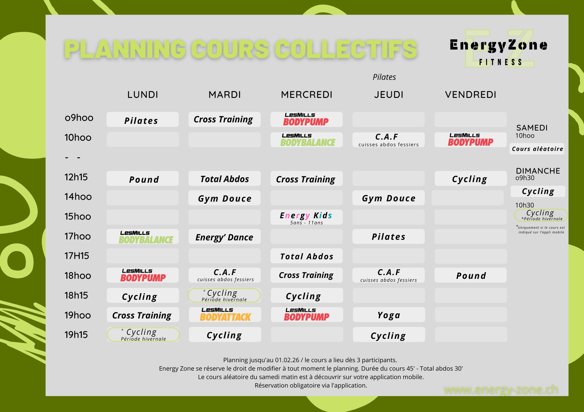 Rejoignez l'ambiance dynamique de nos cours collectifs à Energy Zone. Des instructeurs passionnés, une musique motivante, et une communauté soudée vous attendent pour transformer chaque entraînement en un moment de plaisir partagé.